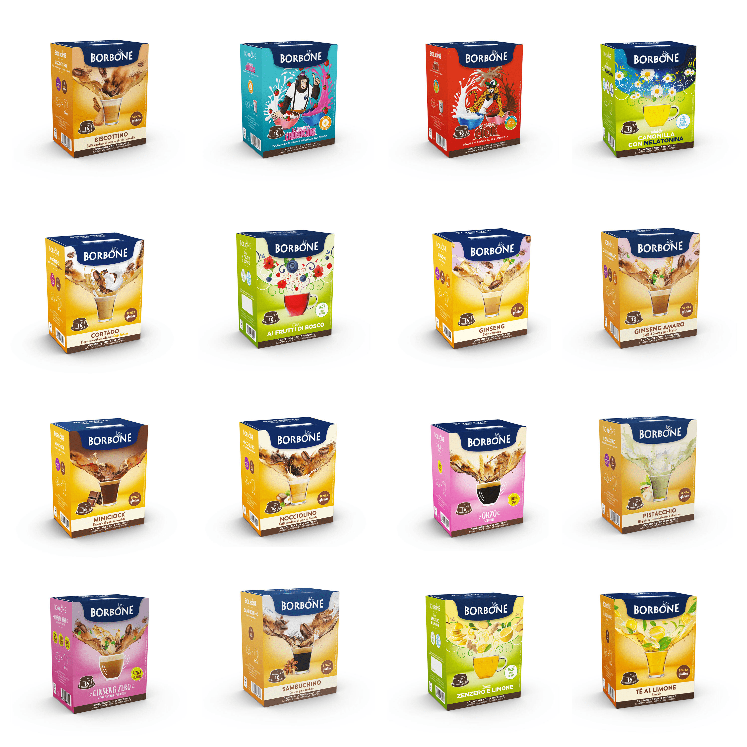 18 confezioni da 16 capsule di Infusi & Solubili Borbone per sistema Lavazza A Modo Mio Gusti assortiti a vostra scelta tra i seguenti tipi di gusti: