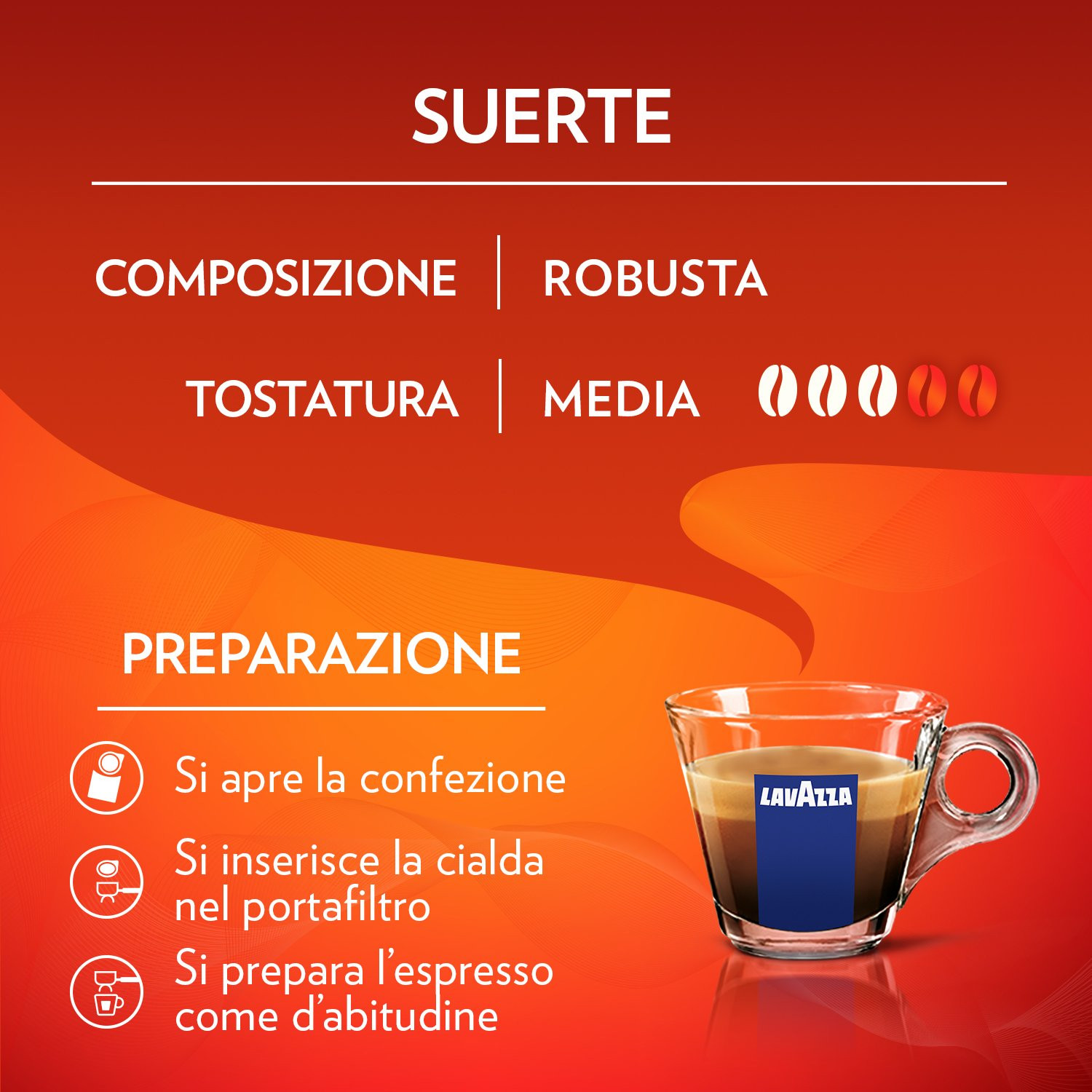 Suerte - Ricco e Deciso. Frutto di oltre un secolo di esperienza nell’arte della torrefazione e miscelazione, Suerte in cialde è il caffè ideale per soddisfare chi ama un gusto più deciso.