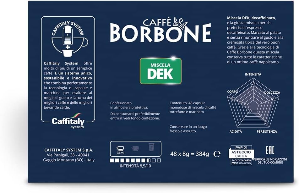 - Miscela Dek - Tutto il piacere dell’espresso napoletano come al bar, anche a casa, con le Capsule Originali Caffitaly®* declinate nella miscela Dek Caffè Borbone. Miscela DEK, decaffeinato, è la giusta miscela per chi preferisce l’espresso decaffeinato. Marcato al palato e senza rinunciare al gusto e alla cremosità tipica del vero buon caffè. Grazie alla tecnologia di Caffè Borbone questa miscela conserva tutte le caratteristiche di un ottimo caffè napoletano.